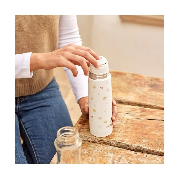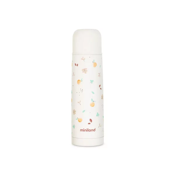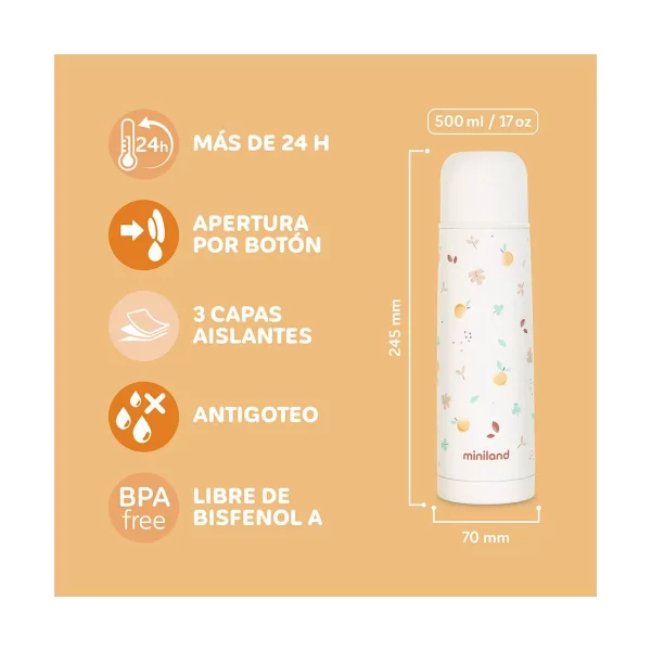 Mantiene la temperatura de los líquidos más de 24 horas Los termos de Miniland presentan una alta resistencia y eficacia gracias a su doble pared de acero con exclusiva capa de cobre y su cámara de vacío. Sistema de vertido fácil Con thermy los papás no derramarán ni una gota del contenido gracias a su sistema de fácil vertido y cierre por pulsación que permite abrir y cerrar el temo con un solo dedo y sin necesidad de desenroscar el tapón interno. Materiales de una calidad excepcional Fabricado con acero de 18/8 (acero 304), que presenta muy baja conductividad térmica y muy buena resistencia a las altas temperaturas, el más adecuado para la conservación de alimentos. Las tomas del bebé  siempre a punto Los papás pueden preparar en casa las tomas del bebé y llevarlas a cualquier lugar, manteniendo durante muchas horas la temperatura deseada. Una opción de regalo perfecta para recién nacidos Los thermy de Miniland cuentan con un cálido y original diseño inspirado en los suaves colores del bosque mediterráneo. Ambos modelos cuentan con un acabado exterior de suave tacto gomoso. Desmontable y fácil de limpiar Tanto la tapa del termo, que puede utilizarse como vaso, como la válvula son desenroscables, facilitando la limpieza de todos los componentes. Sin bisfenol A100% libre de BPA.