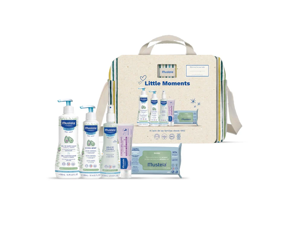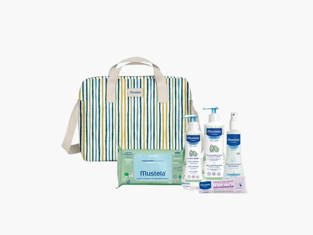 Bolsa de Paseo para bebé, 100% de algodón con un print moderno y 5 productos esenciales Mustela para el cuidado del bebé. ¡Un regalo imprescindible para futuros padres!